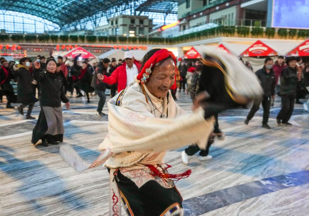 チベット族の伝統舞踊「鍋荘舞」を踊る那曲市民。(2月11日撮影、那曲=新華社記者/晋美多吉)
