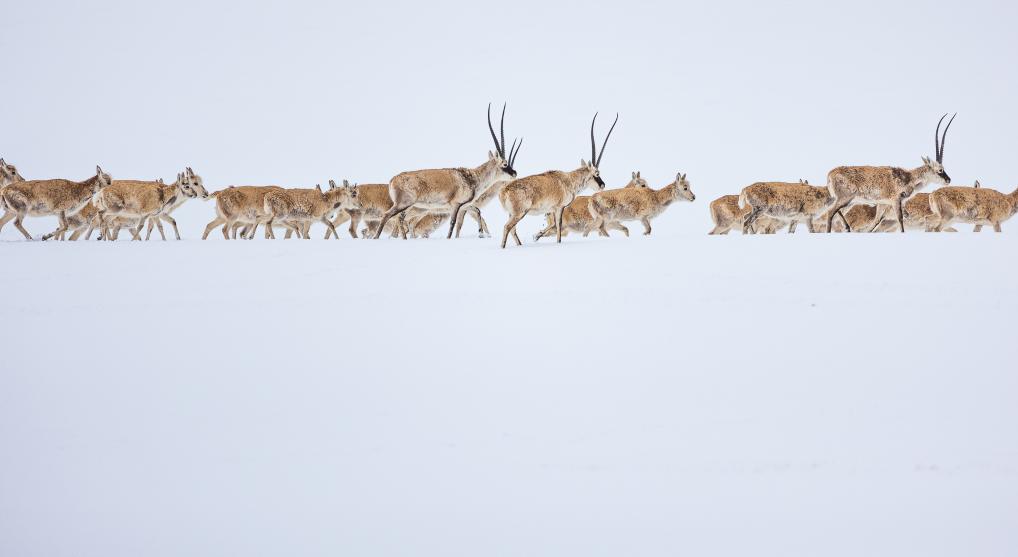 那曲市の羌塘(チャンタン)国家級自然保護区で出産場所へ移動するチルー(チベットカモシカ)。(2024年5月8日撮影、那曲=新華社記者/丁増尼達)