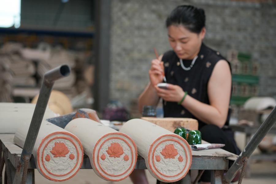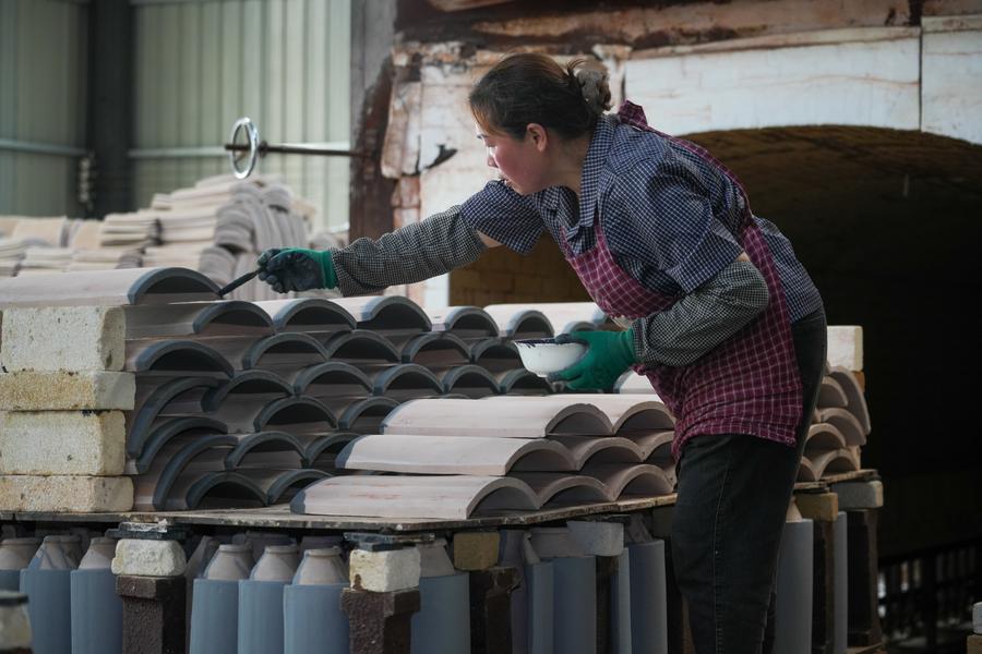 9日、任丘市出岸鎮のレンガ工房で瑠璃瓦にうわぐすりを塗る作業員。(任丘=新華社配信/韓慧峰)