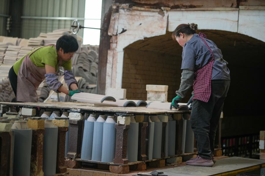 9日、任丘市出岸鎮のレンガ工房で瑠璃瓦を並べる作業員。(任丘=新華社配信/韓慧峰)