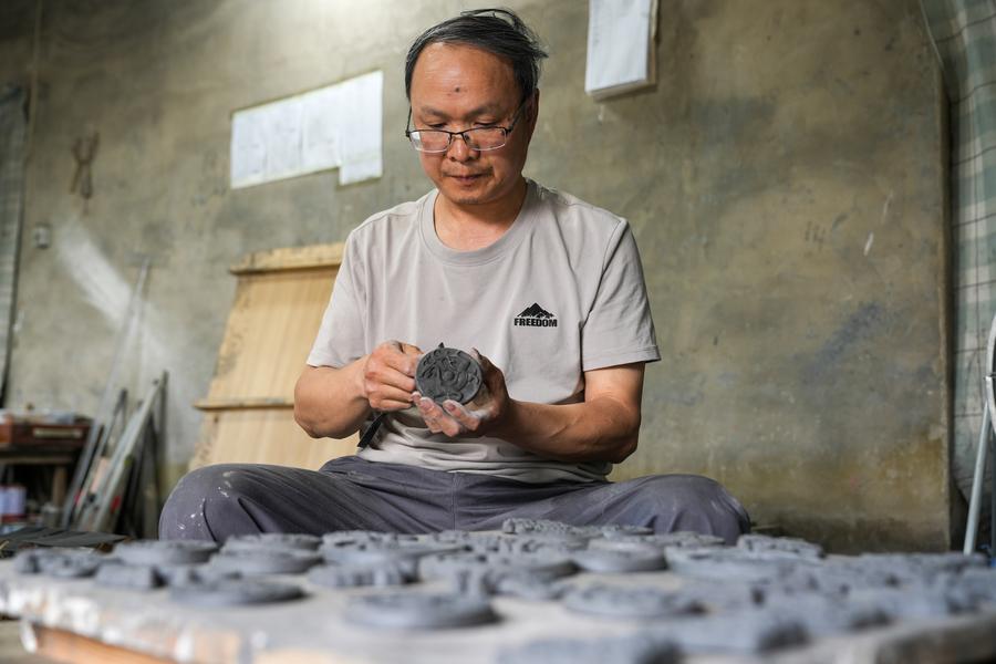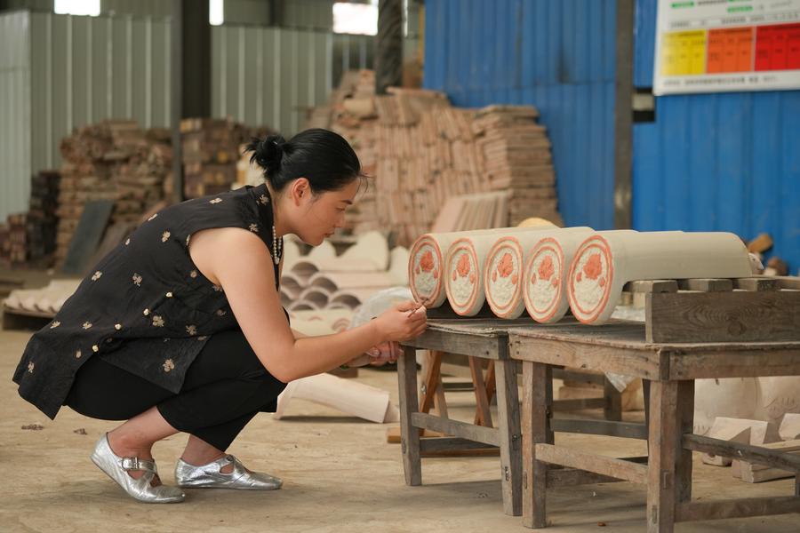 9日、任丘市出岸鎮のレンガ工房で瓦に彫刻する作業員。(任丘=新華社配信/韓慧峰)