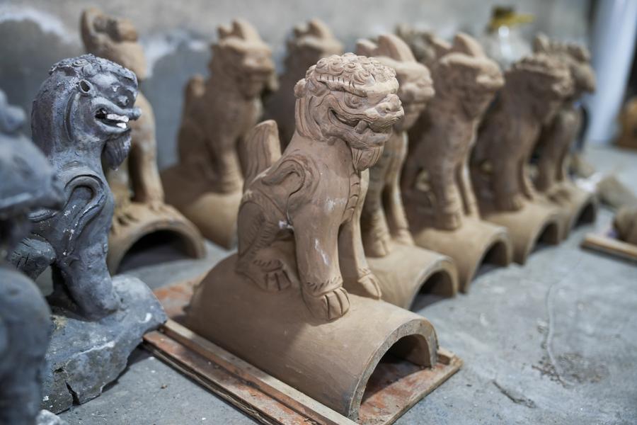 9日、任丘市出岸鎮のレンガ工房に並んだ、神獣像付きの瓦の半製品。(任丘=新華社配信/韓慧峰)