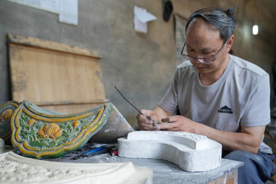 9日、任丘市出岸鎮のレンガ工房で瓦に彫刻を施す作業員。(任丘=新華社配信/韓慧峰)