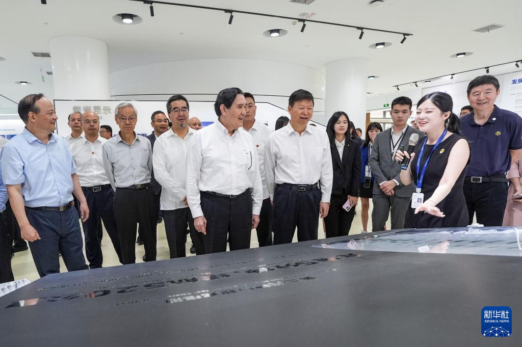 17日、中国車載電池大手の寧徳時代新能源科技(CATL)の企業展示館を見学する馬英九氏一行。(福州=新華社記者/陳曄華)