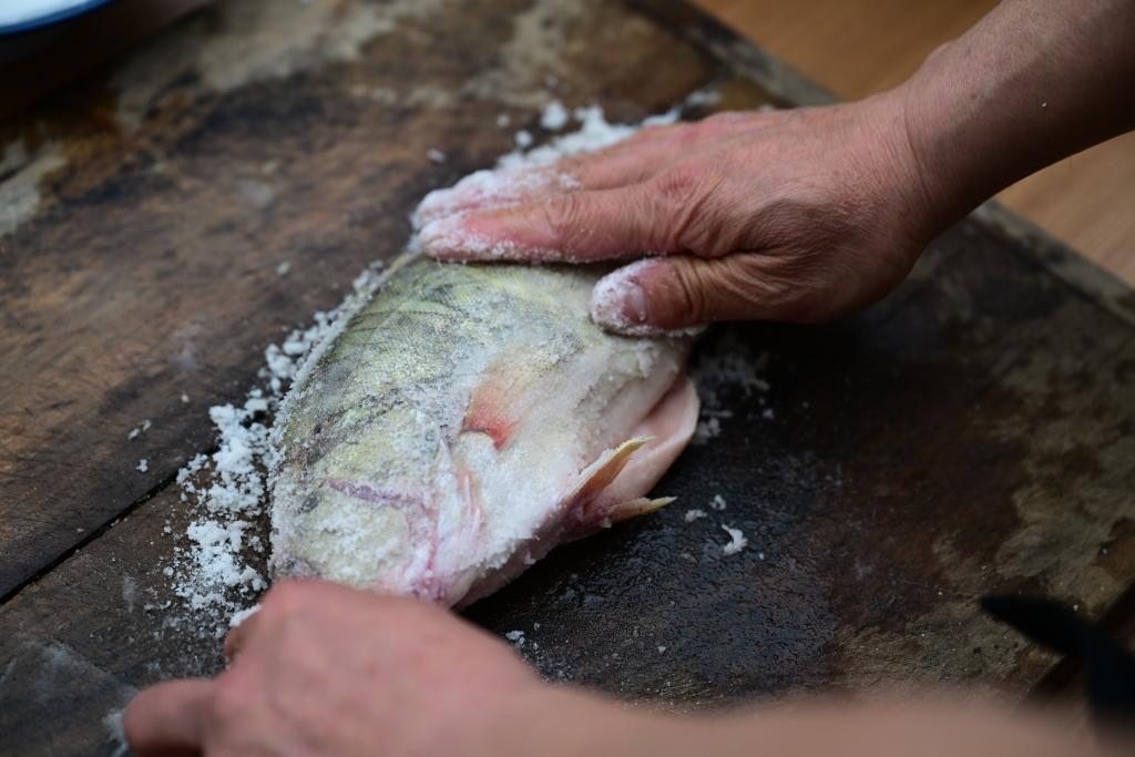 ケツギョの塩漬けをする省級無形文化遺産、徽州臭鱖魚制作技術の伝承者、鍾少華(しょう・しょうか)さん。(4月16日撮影、合肥=新華社記者/周牧)
