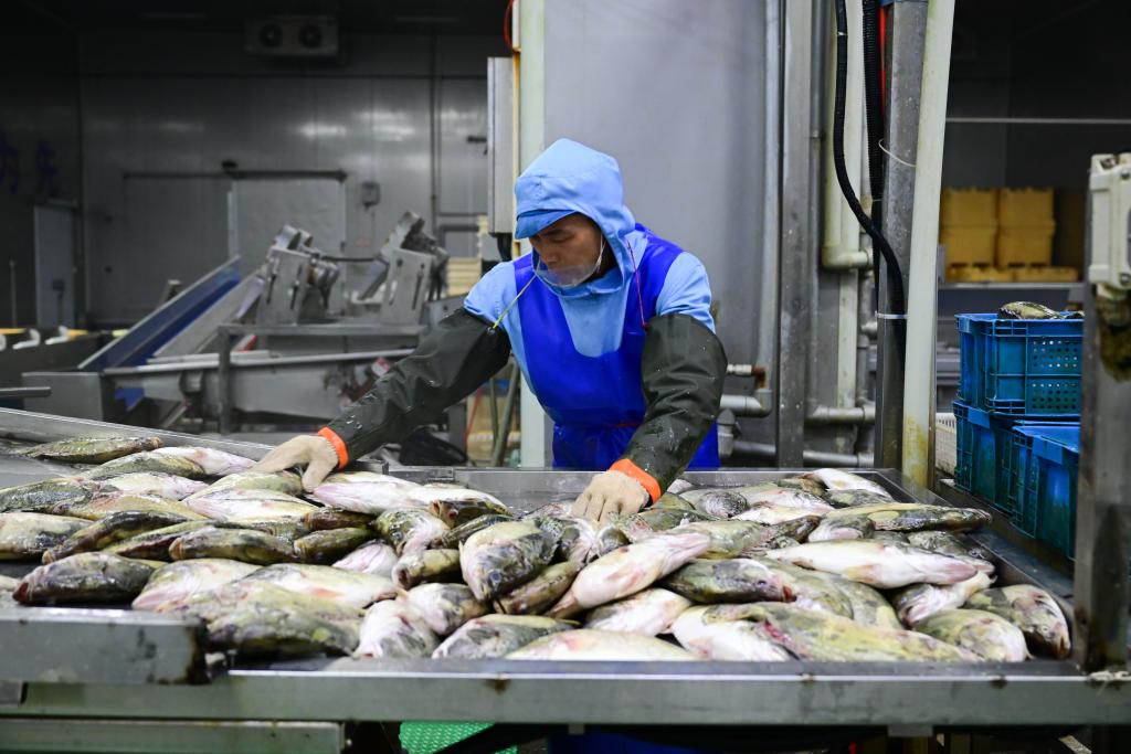 食品の生産・加工・販売などを手がける地元企業、黄山皖新徽三食品供応鏈で、臭鱖魚を加工する従業員。(4月16日撮影、合肥=新華社記者/周牧)