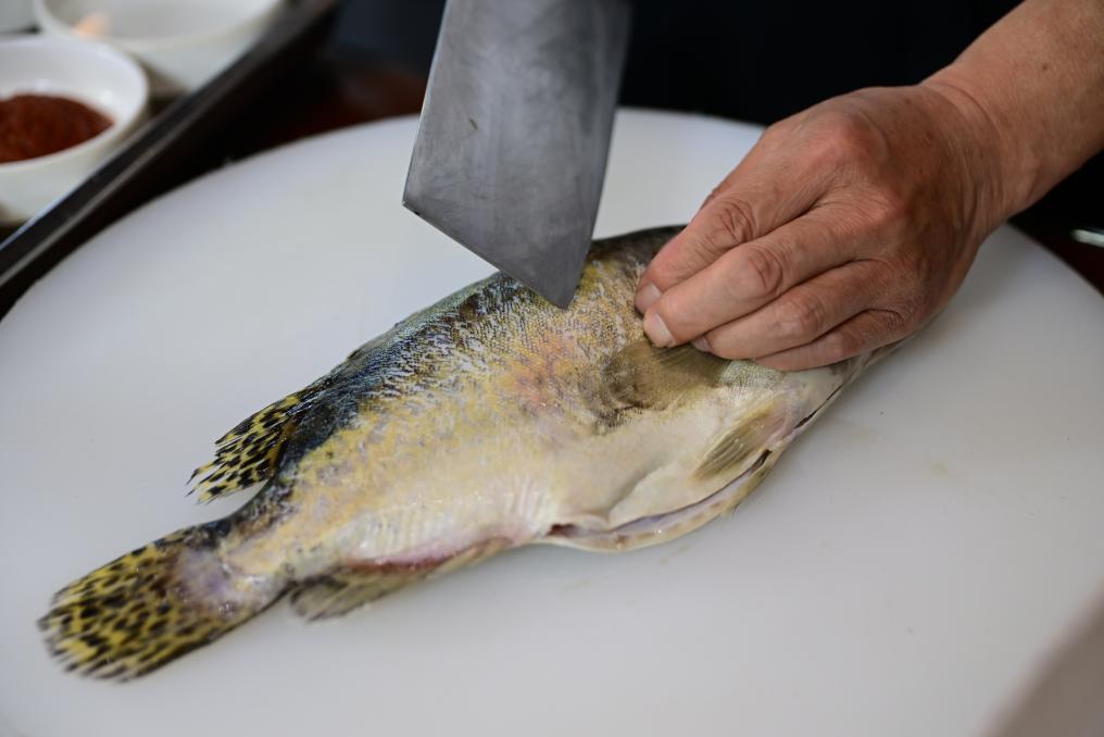 ケツギョを調理する省級無形文化遺産、徽州臭鱖魚制作技術の伝承者、鍾少華(しょう・しょうか)さん。(4月16日撮影、合肥=新華社記者/周牧)