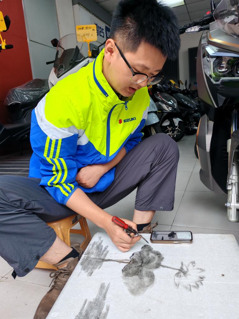 【新華社重慶6月19日】機械油にまみれた修理工場で、作業の合間に工具を使って描かれた絵が、中国のSNSで注目を集めている。重慶市忠県でバイク整備士として働く談暁虎(だん・ぎょうこ)さん(1997年生まれ)は、筆の代わりにスパナやドライバー、インクの代わりに機械油を使い、水墨画のような独自の表現手法を編み出した。