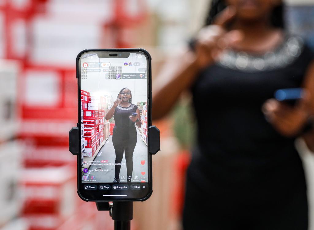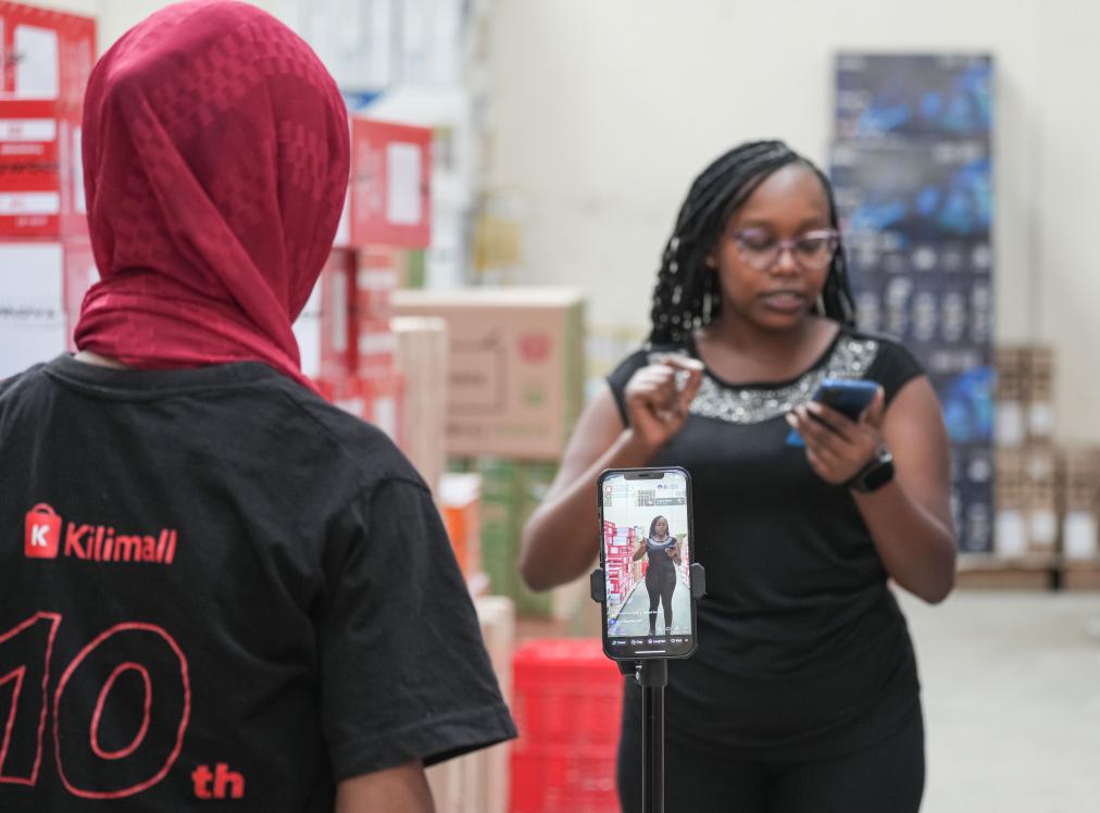 3日、ケニア・マロロンゴで、ライブ配信で商品のプロモーションを行う「キリモール」の従業員。(ナイロビ=新華社記者/李亜輝)