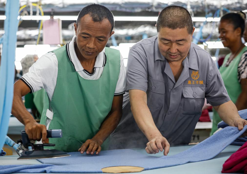 マダガスカル・アンタナナリボにある、内蒙古鹿王羊絨(カシミヤ製品メーカー)の工場で、現地の従業員に技術指導を行う中国人スタッフ。(3月28日撮影、ナイロビ=新華社記者/李亜輝)