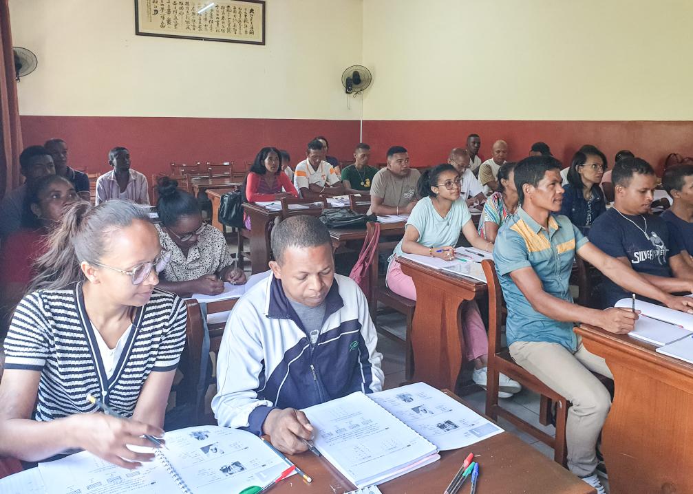 マダガスカル・アンタナナリボにある孔子学院で中国語を学ぶ、内蒙古鹿王羊絨の現地工場の従業員。(資料写真、ナイロビ=新華社記者/李亜輝)