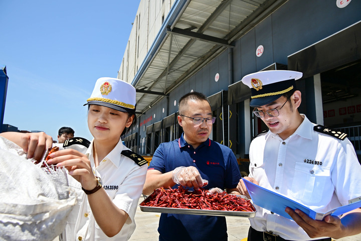 山東省青島市にある冷凍倉庫でルワンダから輸入されたトウガラシをチェックする税関スタッフ。(6月11日撮影、青島=新華社記者/李紫恒)