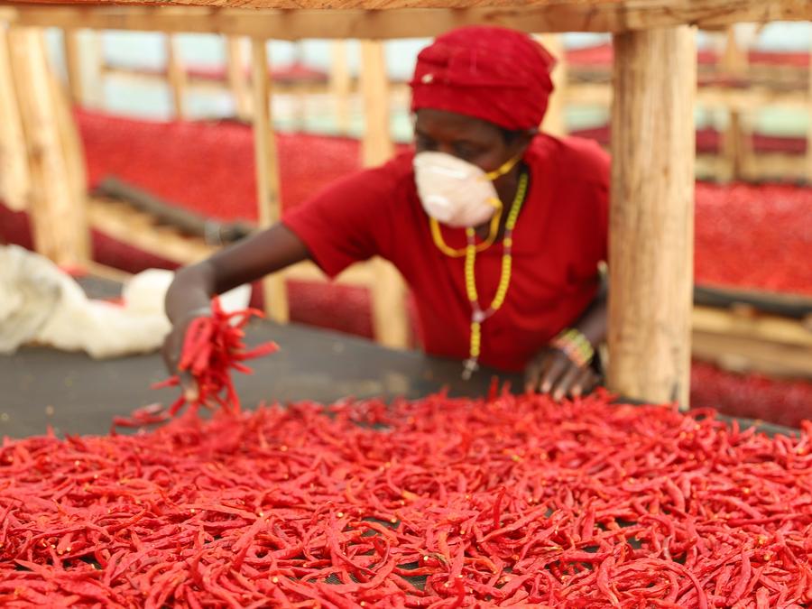 ルワンダ東部州ニャガタレ郡でトウガラシの選別を行う作業員。(5月22日撮影、ニャガタレ=新華社記者/吉莉)