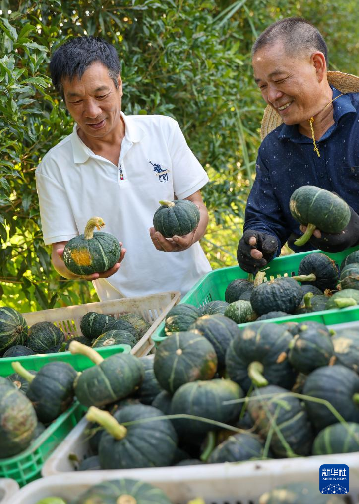 28日、貝貝カボチャを収穫する農業企業の従業員。 (武夷山=新華社配信/邱汝泉)