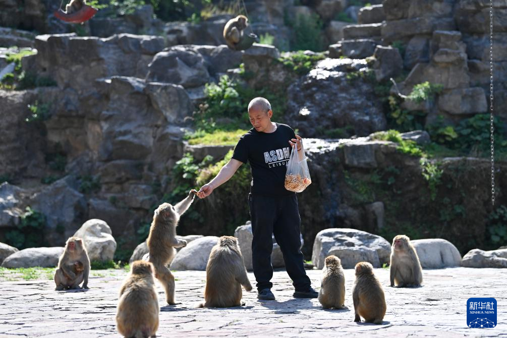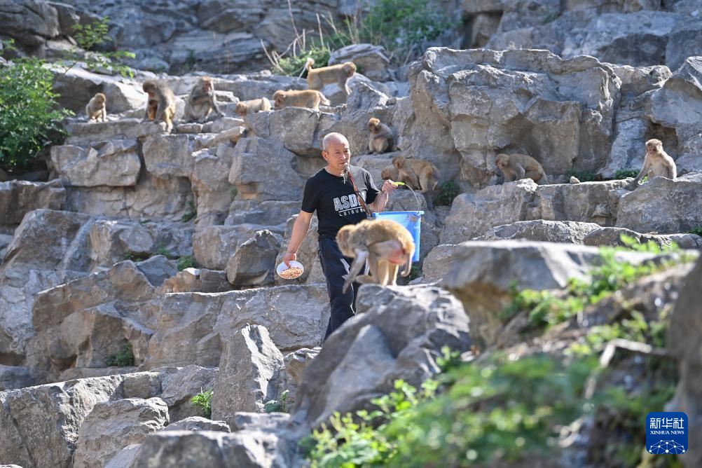 蟒河アカゲザル国家級自然保護区でサルに餌を与えるスタッフ。(5月21日撮影、晋城=新華社記者/楊晨光)