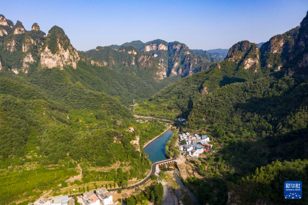 蟒河アカゲザル国家級自然保護区の風景。(5月21日、ドローンから、晋城=新華社記者/楊晨光)