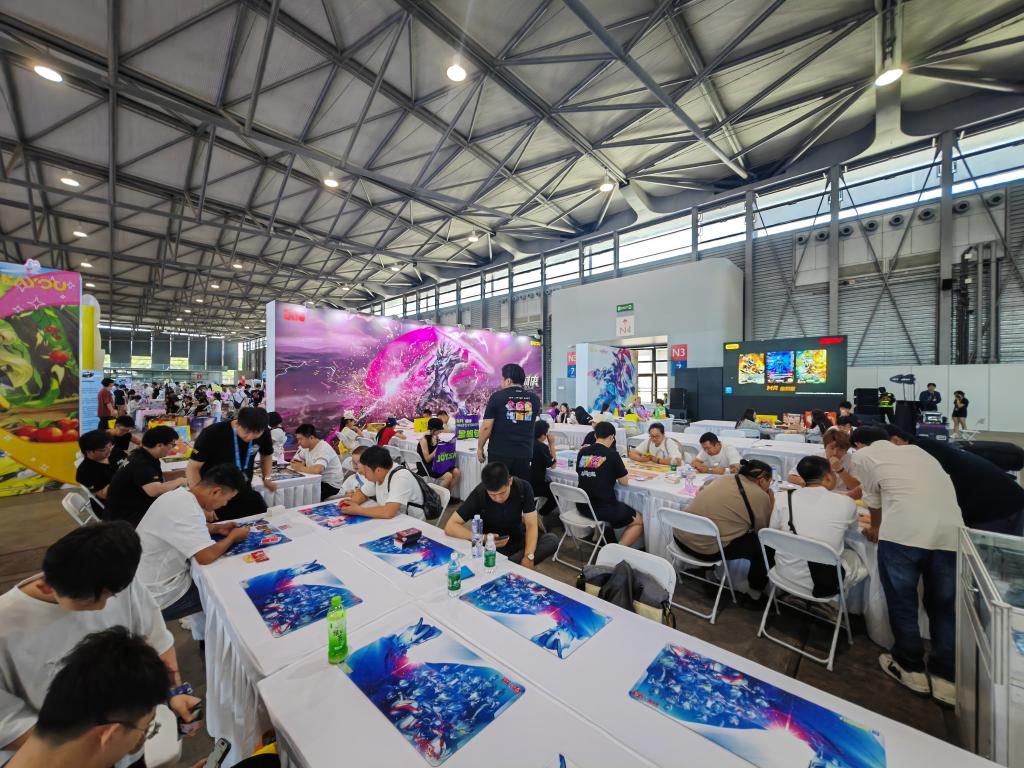 4日、カードゲーム館でトレーディングカードゲームの対戦などを楽しむ来場者。(上海=新華社記者/張夢潔)