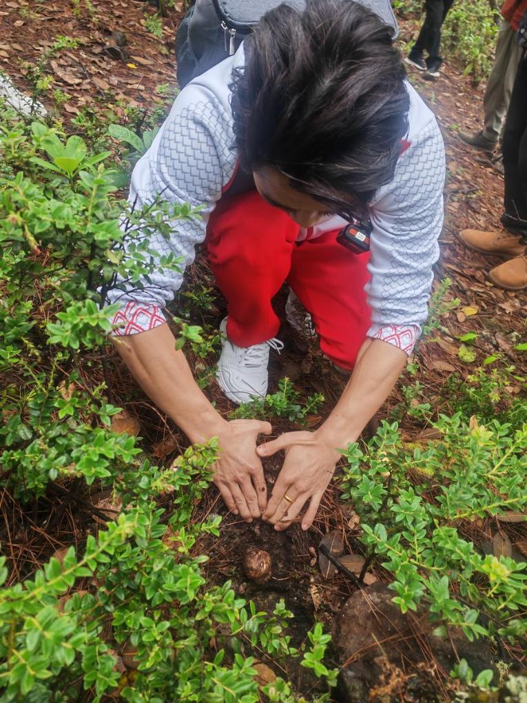 5日、雲南省デチェン・チベット族自治州シャングリラ市ニシ郷の山中で、マツタケ狩りを体験する観光客。(シャングリラ=新華社記者/浦超)