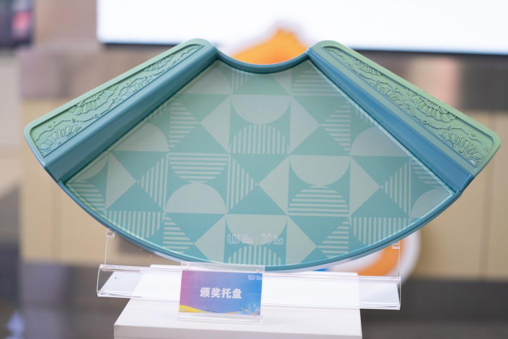 8日、ワールドゲームズ成都大会の表彰式で使う扇形のメダルトレー。持ち手には、三星堆文化のシンボル「太陽神鳥」の羽ばたく姿と咲き誇るハスのレリーフがあしらわれている。(成都=新華社配信/陳居偉)