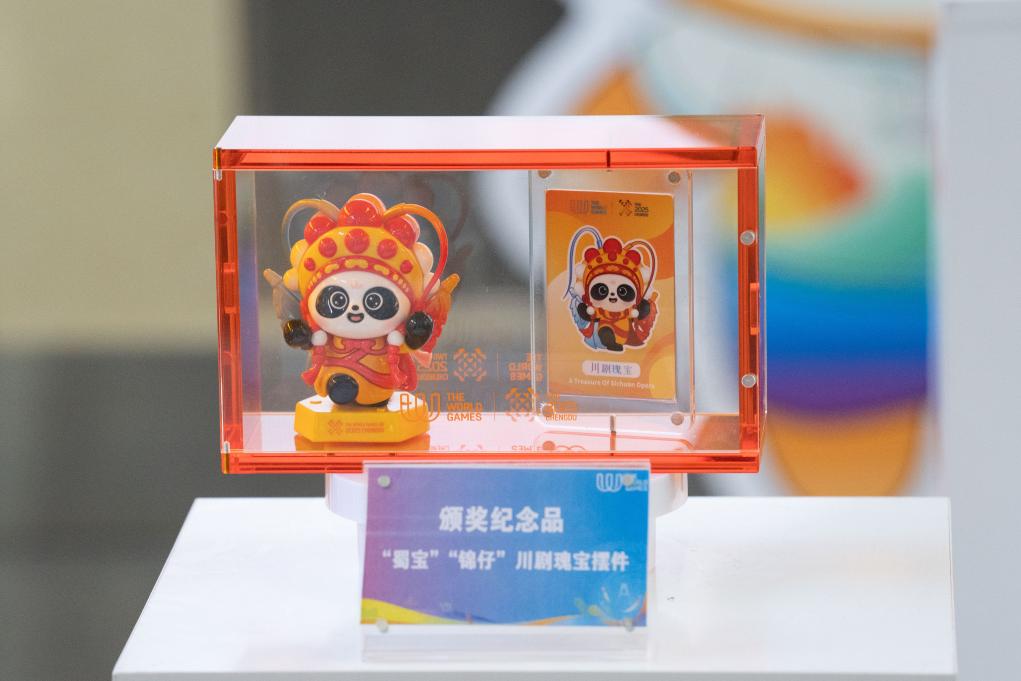 8日、ワールドゲームズ成都大会の表彰式で授与される記念品の置物。「川劇(四川省の伝統劇)」の変臉(へんれん=隈取りの仮面の早変わり)から着想を得た革新的なデザインで、川劇の衣装を身にまとった大会マスコット「蜀宝(シューバオ)」と「錦仔(ジンザイ)」が背中合わせに配置されている。(成都=新華社配信/陳居偉)