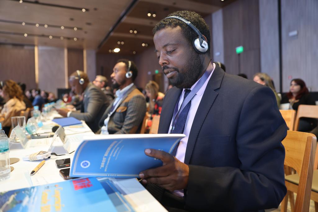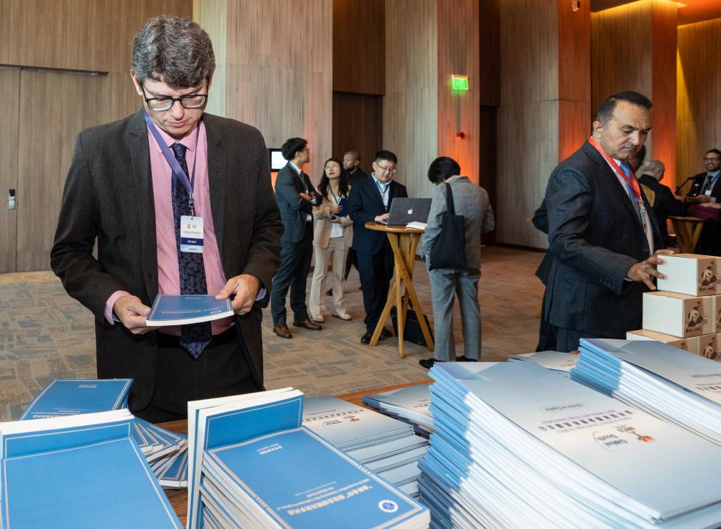 16日、新華社の政策研究組織「国家ハイエンドシンクタンク」が発表した報告書に目を通す来場者。(リオデジャネイロ=新華社記者/李夢馨)