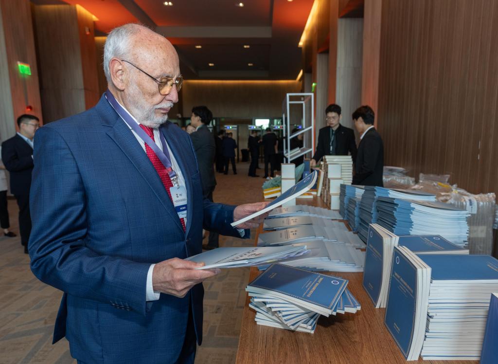 16日、新華社の政策研究組織「国家ハイエンドシンクタンク」が発表した報告書を手に取る来場者。(リオデジャネイロ=新華社記者/王天聡)