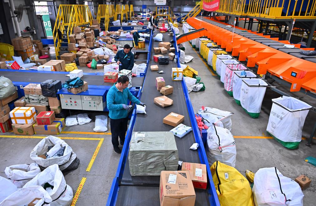 四川省眉山市にある中国郵政集団の郵便物処理センターで荷物を仕分ける従業員。(資料写真、眉山=新華社配信/潘建勇)