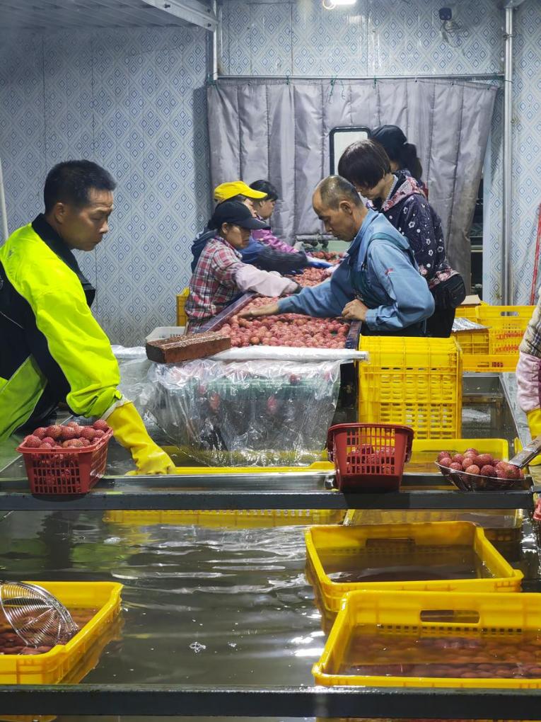 ライチの選別と包装を行う農家の人たち。(霊山=新華社配信/施国輝)