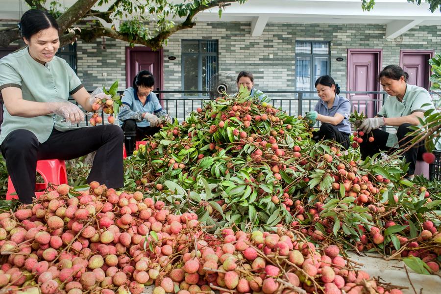 【新華社欽州7月19日】中国広西チワン族自治区欽州市霊山県は国内有数のライチ生産地で、県内の栽培面積は42万ムー(2万8千ヘクタール)に上る。地元ではここ数年、品種改良や環境に配慮した栽培方法の普及、コールドチェーン施設の整備を続け、関連産業の質向上と増産、効率化を推進してきた。