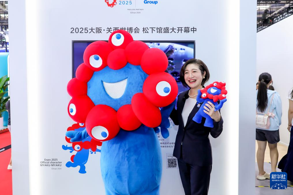 16日、パナソニックのブースで大阪・関西万博のマスコット「ミャクミャク」とポーズを取る小川氏。(北京=新華社配信)