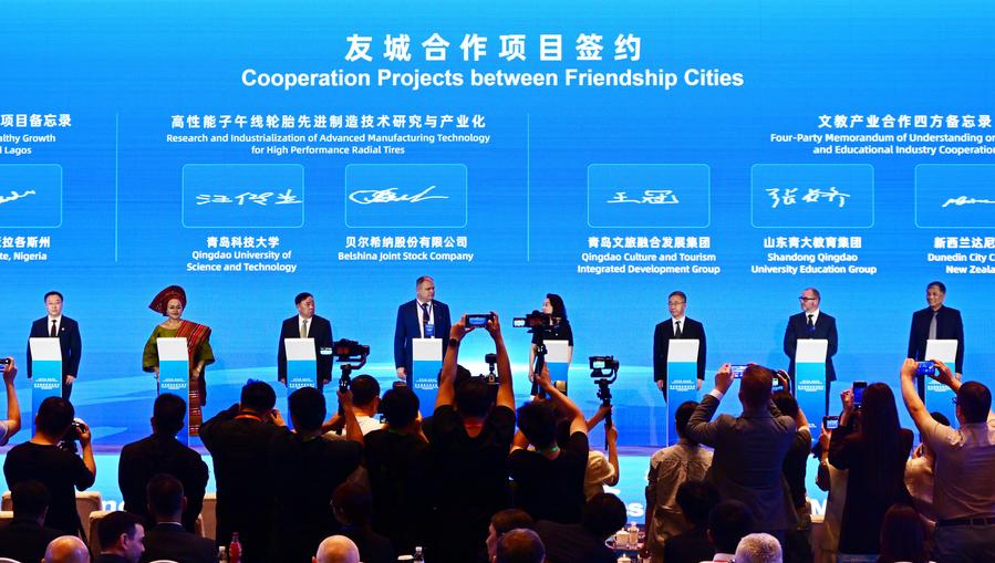 19日、青島国際友好都市交流月間の開幕式で、友好都市協力プロジェクトの調印に臨む来賓。(青島=新華社記者/李紫恒)