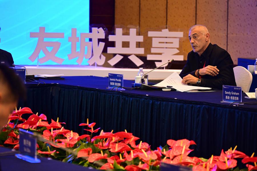 19日、世界市長対話で発言するギリシャ・ピレウス市のジアニス・モラリス市長。(青島=新華社記者/李紫恒)