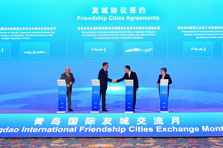 19日、青島国際友好都市交流月間の開幕式で、友好都市協力文書の調印に臨む来賓。青島市はベラルーシ・ミンスク市、ニュージーランド・ダニーデン市とそれぞれ友好協力都市関係深化の覚書を交わし、ハンガリー・ショモジ県と友好協力都市関係の協議書を締結した。(青島=新華社記者/李紫恒)