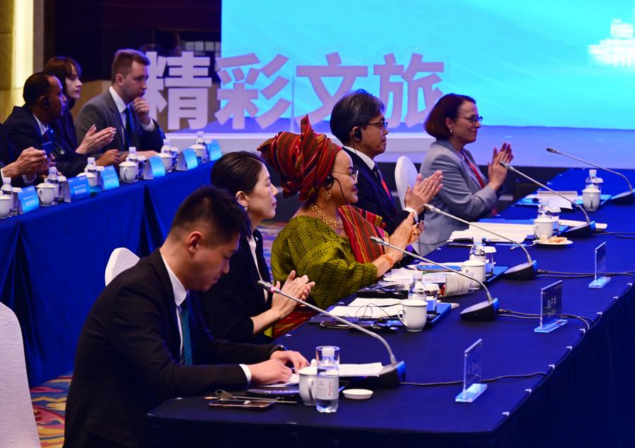 19日、青島国際友好都市交流月間の開幕式に出席する来賓ら。(青島=新華社記者/李紫恒)