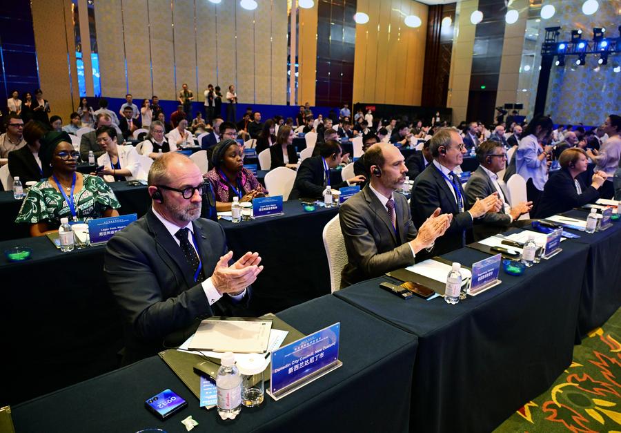19日、世界市長対話に出席する来賓ら。(青島=新華社記者/李紫恒)