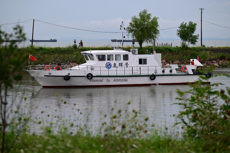 安徽省合肥市の巣湖水域を航行する世界初の純アンモニア燃料船「氨暉(あんき)号」。(6月28日撮影、合肥=新華社記者/周牧)