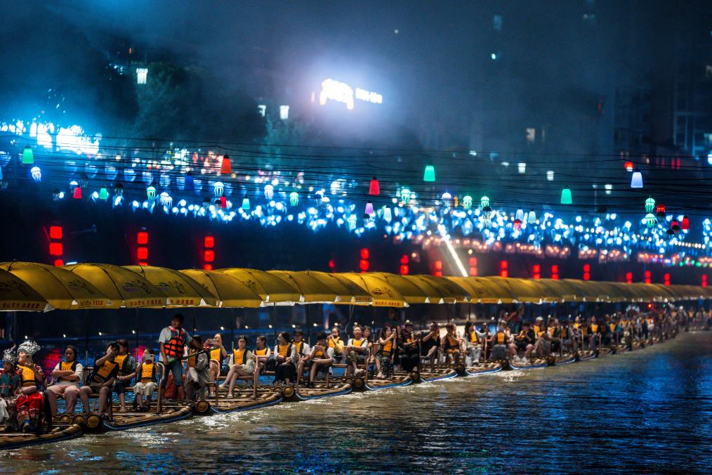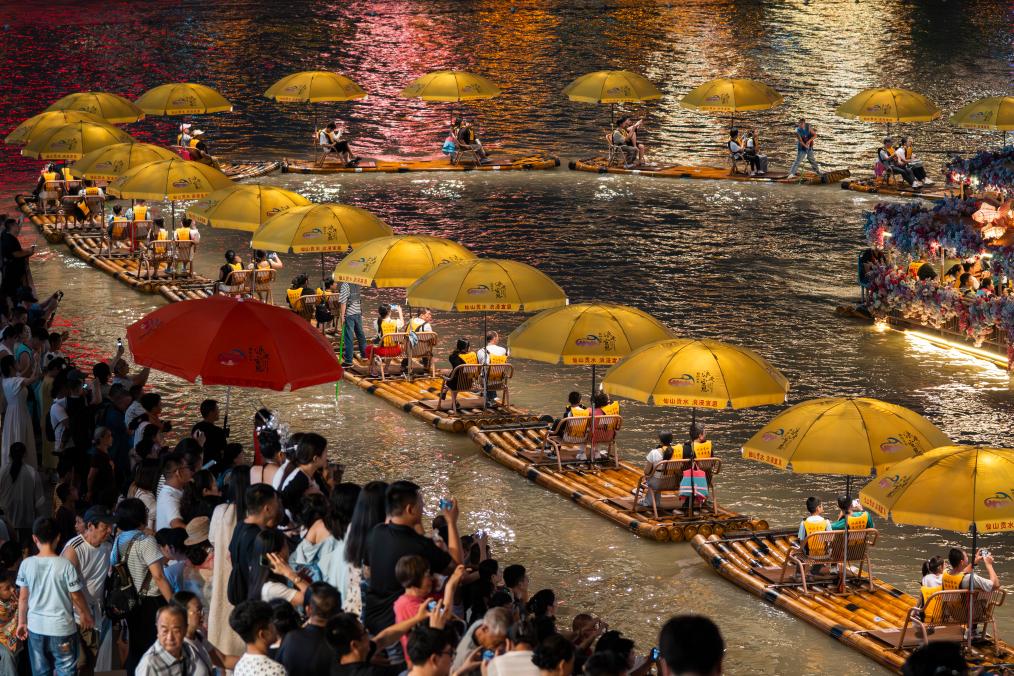 遊覧竹いかだに乗って貢水河の夜景を楽しむ「竜遊貢水」に参加する観光客。(7月9日撮影、宣恩=新華社記者/伍志尊)