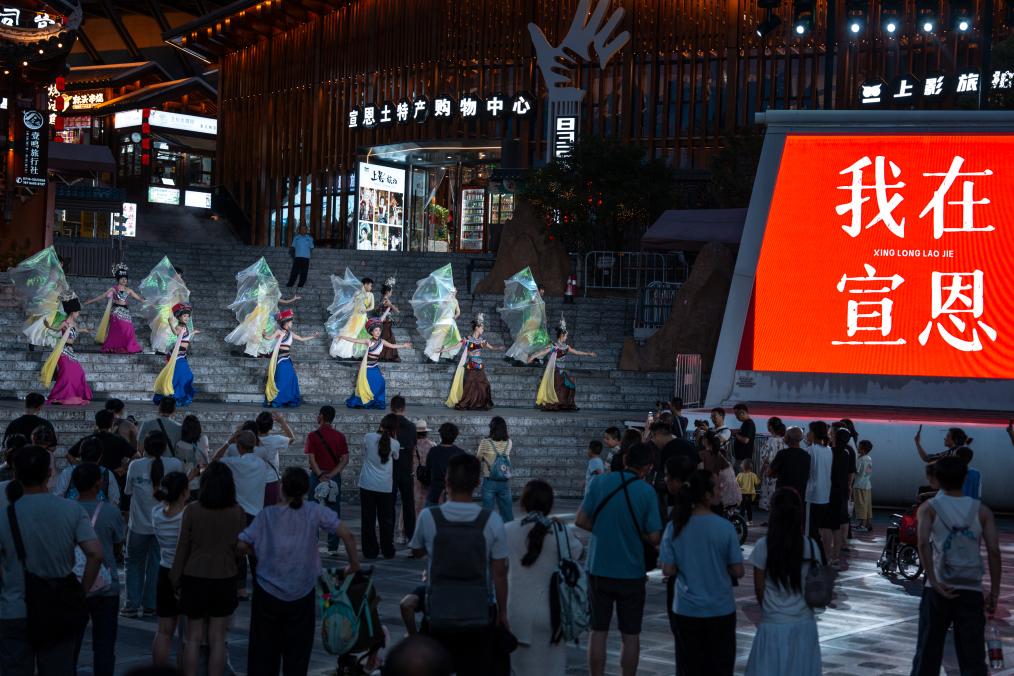 貢水河の岸辺で踊りのパフォーマンスを楽しむ観光客。(7月9日撮影、宣恩=新華社記者/伍志尊)