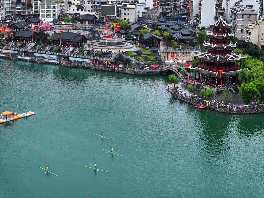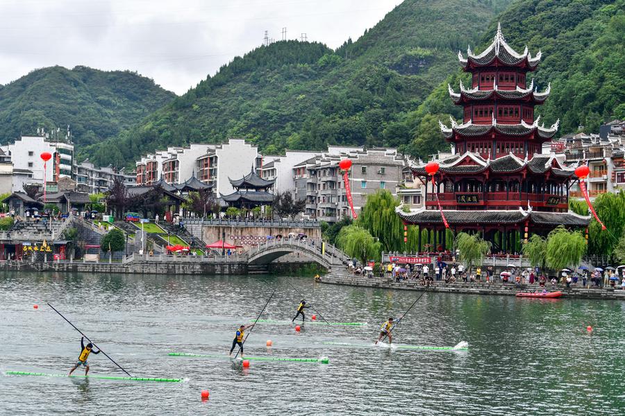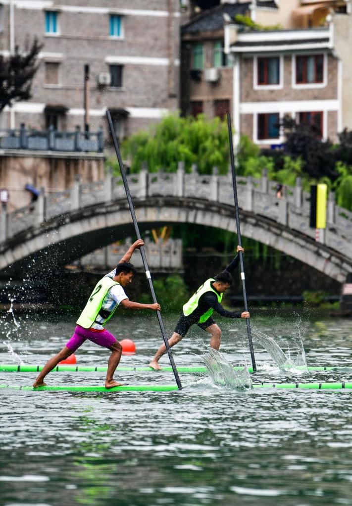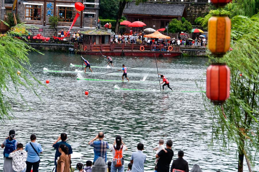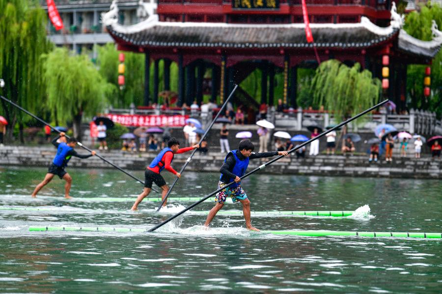 【新華社鎮遠7月24日】中国貴州省黔東南(けんとうなん)ミャオ族トン族自治州の鎮遠古城で22、23両日、「2025年民体杯全国独竹漂大会」が開かれた。独竹漂は1本の竹に乗って川面を進む技芸。浙江、湖北、広西、広東、貴州などの省・自治区から10チームが参加した。
