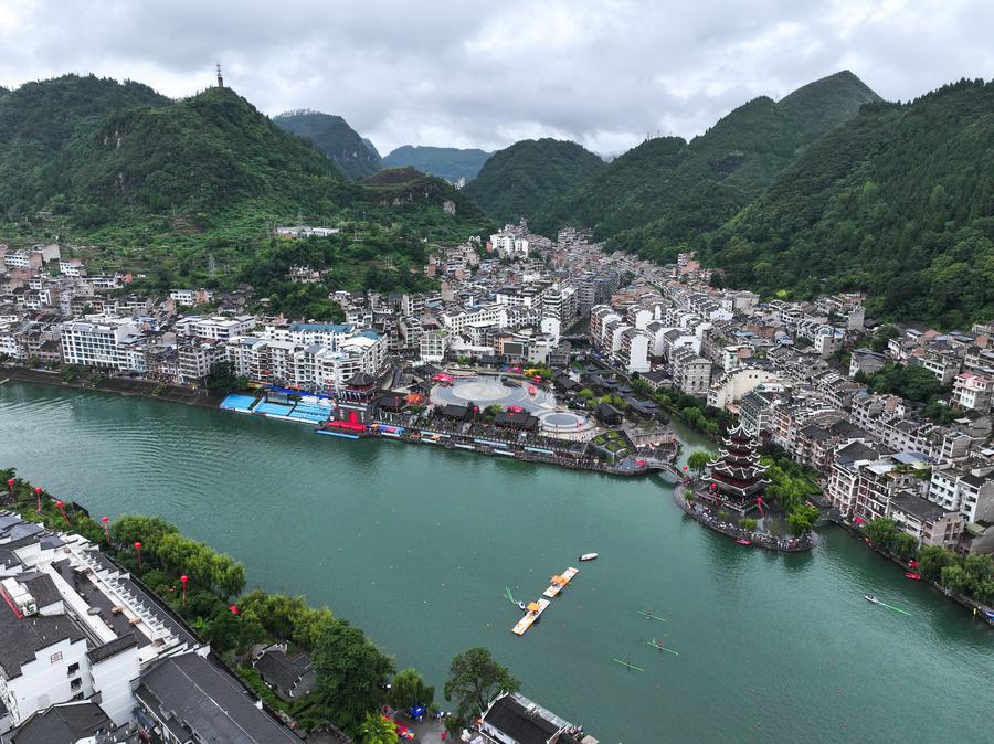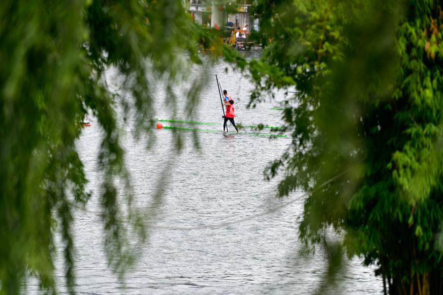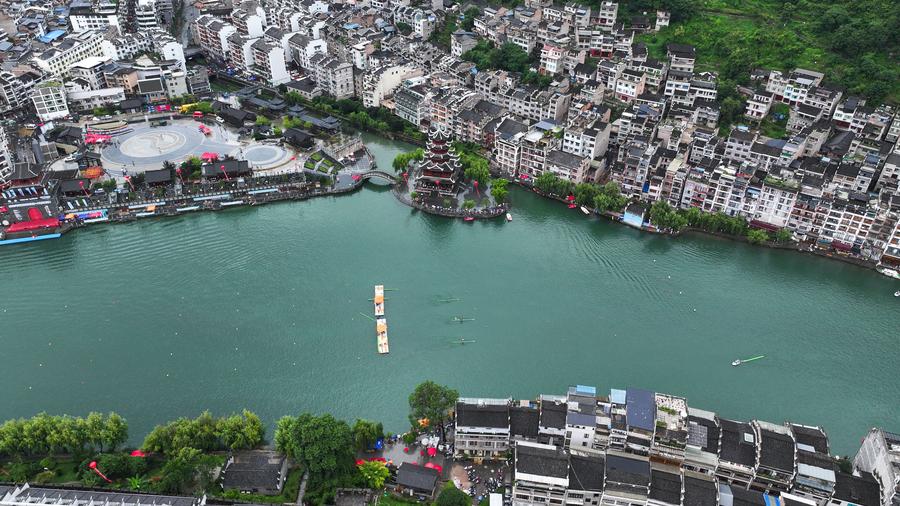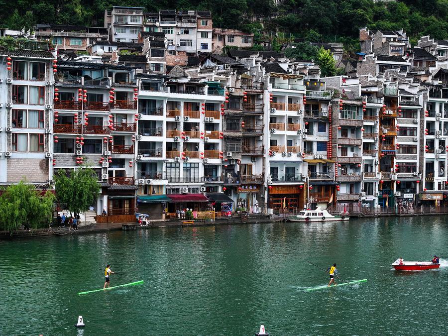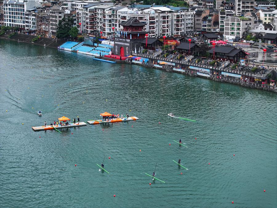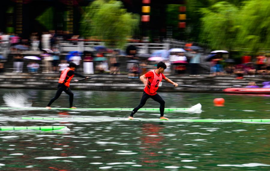 【新華社鎮遠7月24日】中国貴州省黔東南(けんとうなん)ミャオ族トン族自治州の鎮遠古城で22、23両日、「2025年民体杯全国独竹漂大会」が開かれた。独竹漂は1本の竹に乗って川面を進む技芸。浙江、湖北、広西、広東、貴州などの省・自治区から10チームが参加した。