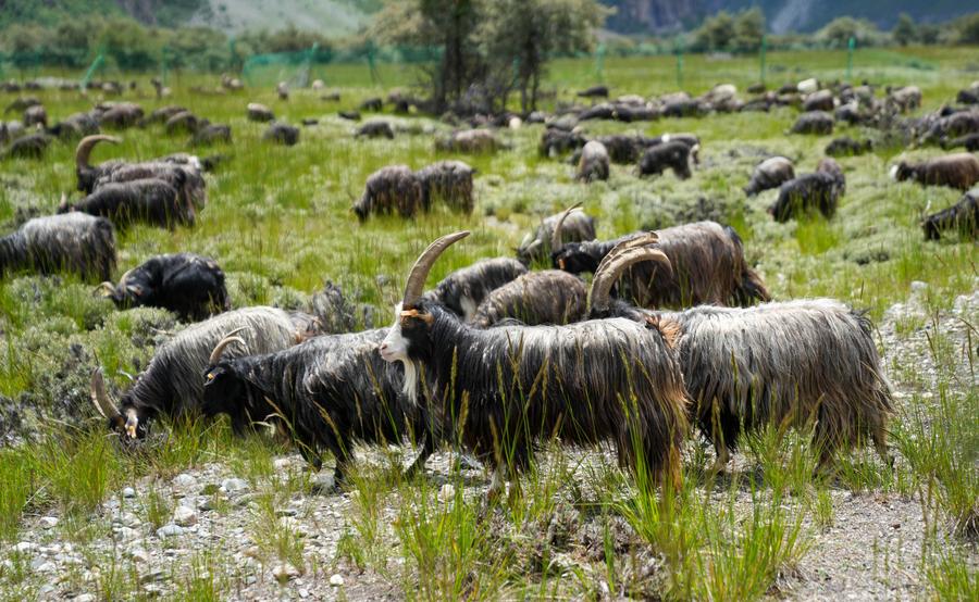 20日、辺壩県の黒ヤギ飼育拠点付近で放牧されている黒ヤギ。(昌都=新華社記者/晋美多吉)