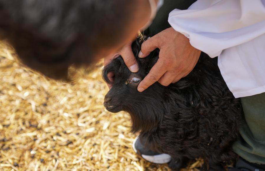 20日、子羊の健康状態を確認する黒ヤギ飼育拠点のスタッフ。(昌都=新華社記者/晋美多吉)