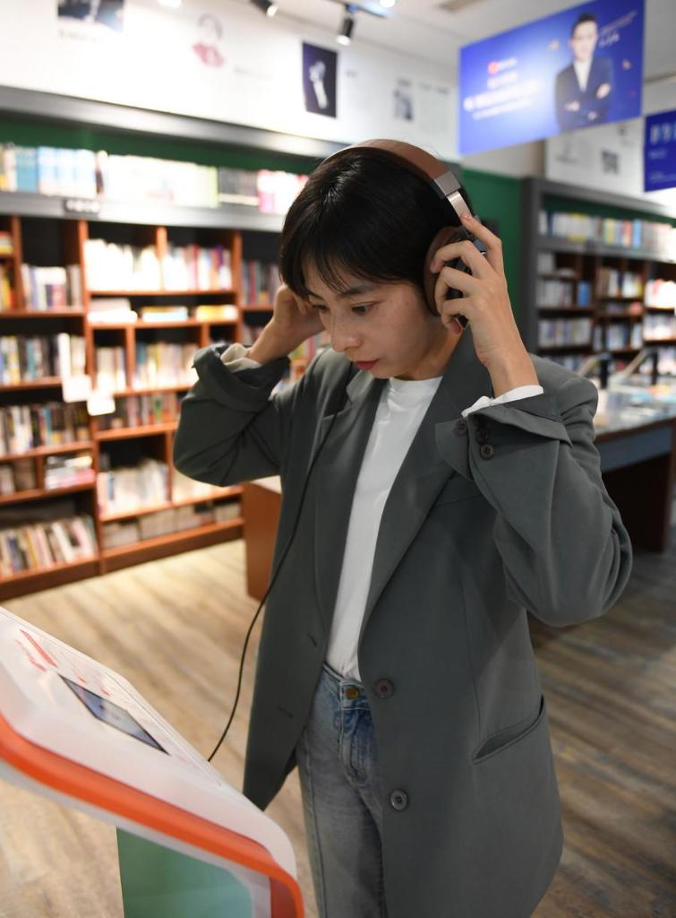 浙江省湖州市の書店でオーディオブックを試聴する客。(2021年4月22日撮影、湖州=新華社記者/翁忻暘)