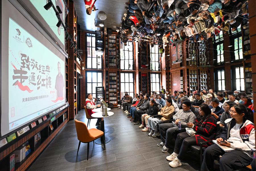 天津市の旧イタリア租界にある鐘書閣書店で開かれた読書交流会。(2024年10月2日撮影、天津=新華社記者/孫凡越)