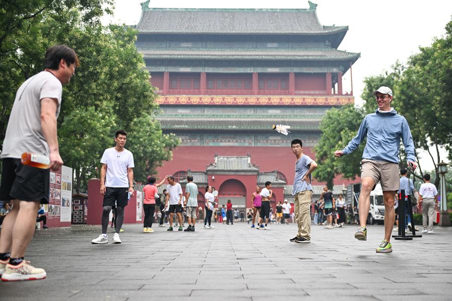 27日、イベント会場の北京鐘鼓楼広場で伝統的な羽根蹴り遊びをする人々。(北京=新華社記者/陳鍾昊)