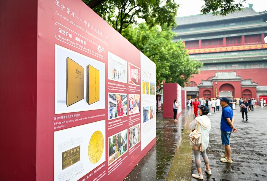 27日、北京の鐘鼓楼広場で、世界遺産登録1周年の成果を紹介するパネル展示を見学する人々。(北京=新華社記者/陳鍾昊)