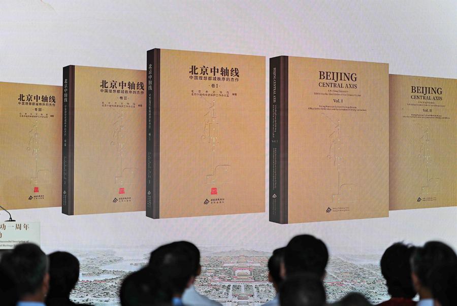 27日、イベント会場で発表されたシリーズ書籍「北京中軸線:中国理想の都城秩序の傑作」。(北京=新華社記者/陳鍾昊)