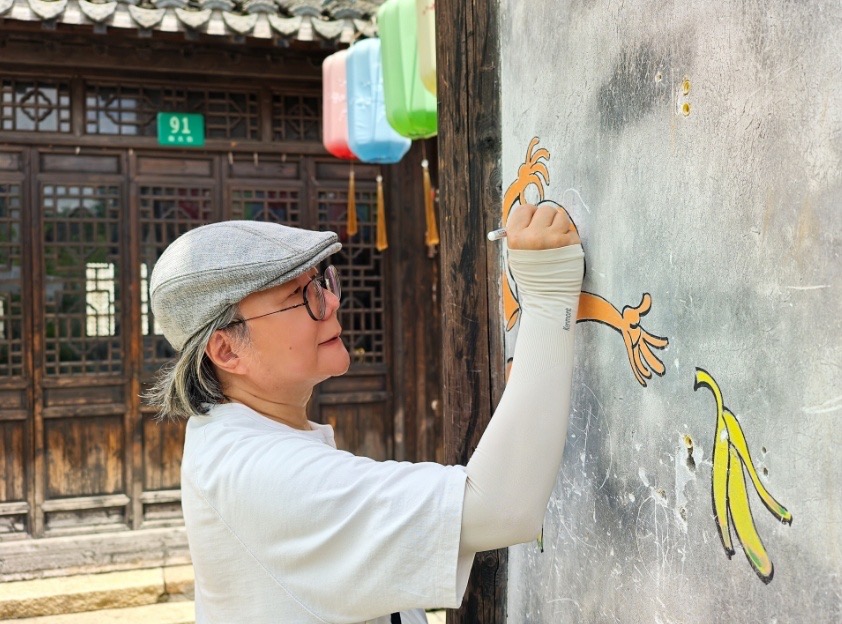 楓涇鎮の壁に作品を描く漫画家。(上海=新華社配信)