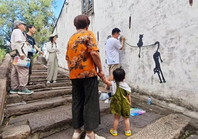2025年第1回楓涇大漫画芸術シーズンは7月に始まり、古い壁の曲がり角や川辺の石段などにさまざまなグラフィティアート作品が彩りを添えている。