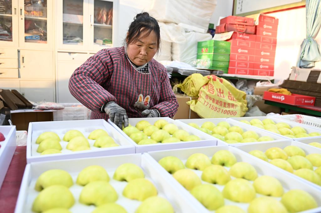 陝西省渭南市の白水県秋林リンゴ専業合作社(協同組合)で「瑞雪」リンゴを箱詰めする作業員。(1月9日撮影、西安=新華社記者/李一博)
